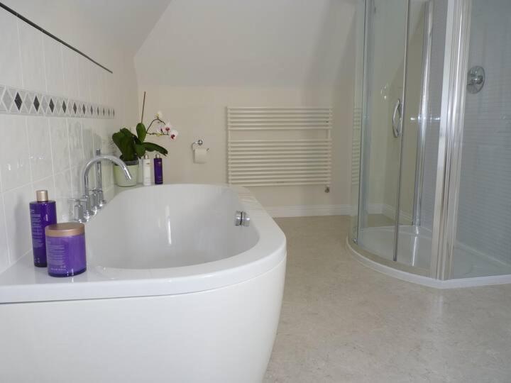 Holiday Home. This holiday home has an open plan kitchendining area, and a living room. It offers an outside seating area with garden views. All 3 bedrooms have en suite bathrooms, and can be configured to contain 9 single beds. A bath and a separate shower are available in one of the bathrooms. On the ground floor, you will find 2 bedrooms. The property has a utility room, which includes a washing machine, a tumble dryer and ironing facilities.