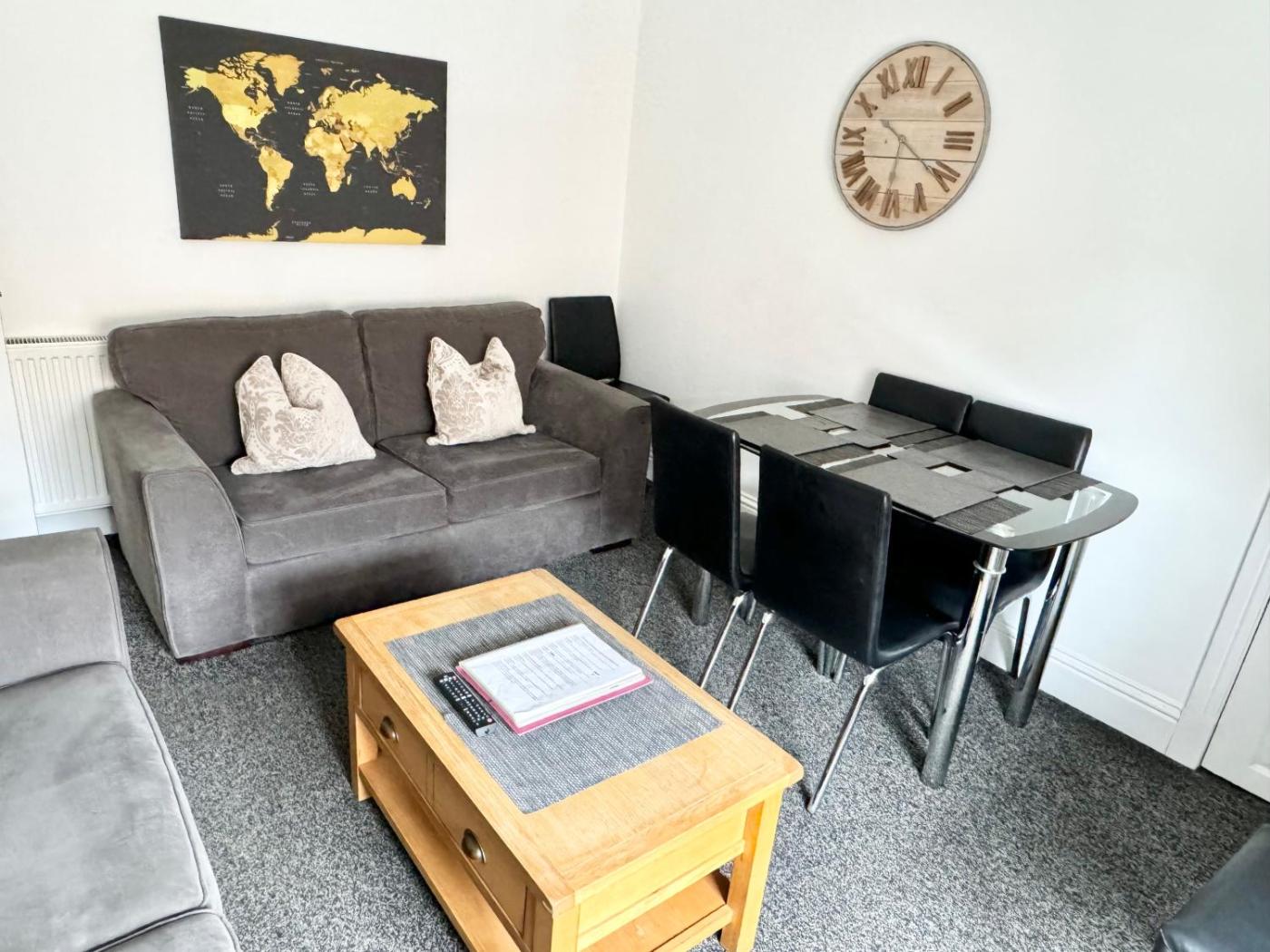 Holiday Home. This spacious holiday home comprises 1 living room, 3 separate bedrooms and 2 bathrooms with a bath and a shower. The fully equipped kitchen features a stovetop, a refrigerator, kitchenware and an oven. The holiday home provides a flat-screen TV with streaming services, a washing machine, a private entrance, a tea and coffee maker as well as city views. The unit offers 3 beds.