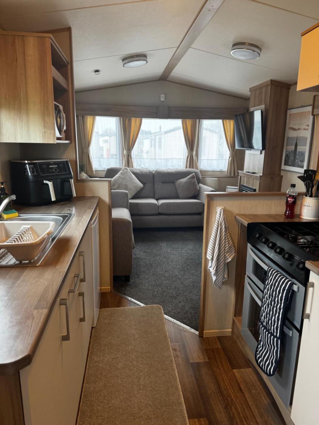 Caravan. The fireplace is a top feature of this mobile home. The fully equipped kitchen has a stovetop, a refrigerator, kitchenware and an oven. The mobile home features a private entrance, a tea and coffee maker, a seating area, a flat-screen TV with streaming services, as well as sea views. The unit has 3 beds.