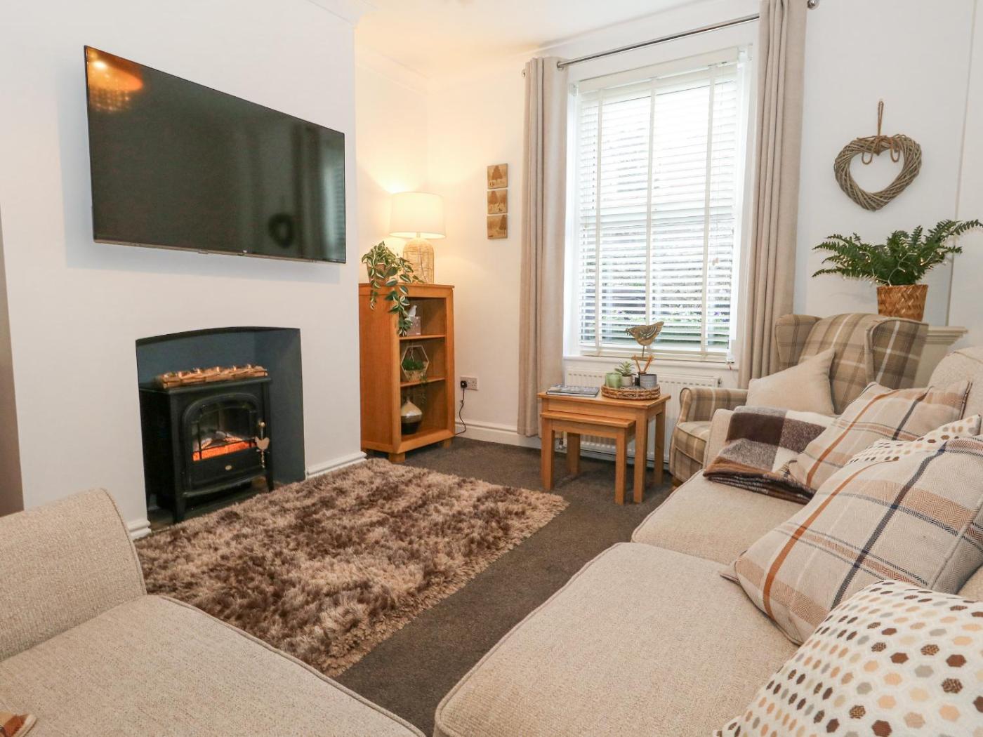 The holiday home has 2 bedrooms, a TV, a fully equipped kitchen with an oven and a microwave, a washing machine, and 1 bathroom with a shower. There is also a seating area and a fireplace.